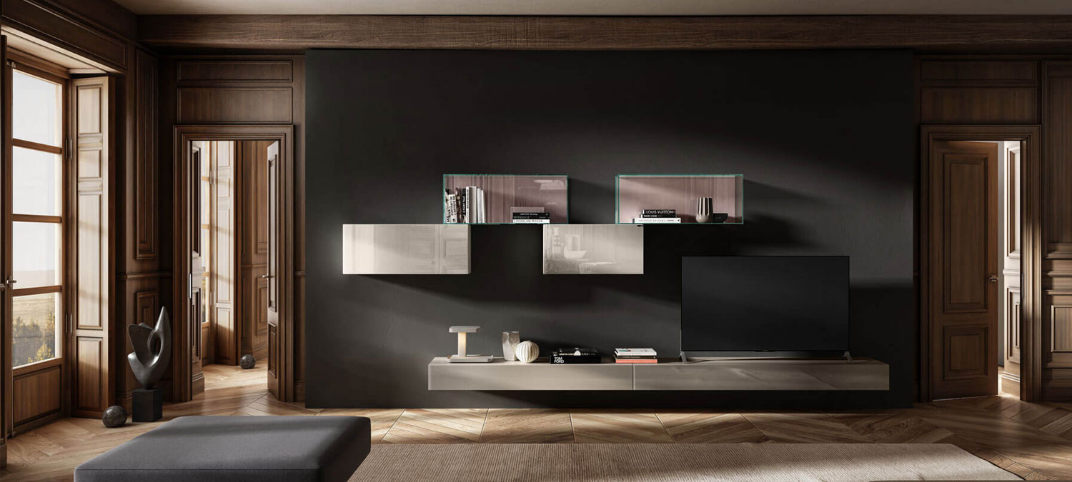 Grâce à l’extrême flexibilité du carré et de ses multiples et sous-multiples, le système 36e8 de Lago, permet dans le séjour, d’habiller le mur avec des géométries insolites et d’offrir d’innombrables opportunités de rangement.