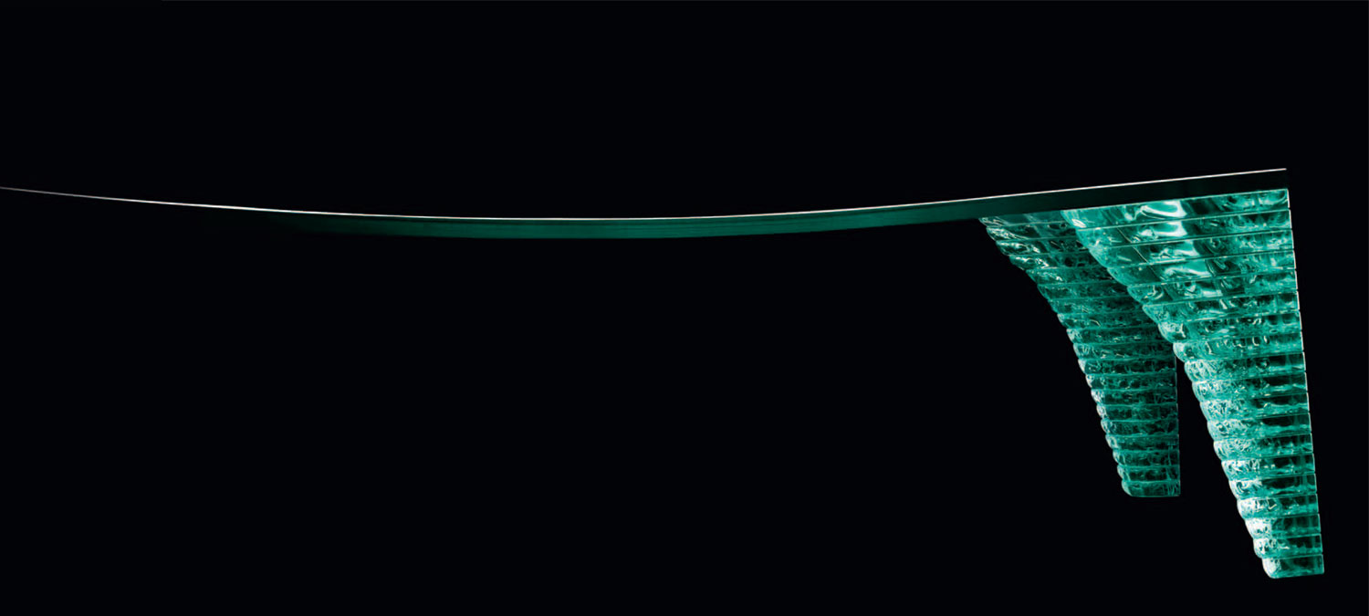La table Atlas possède un plateau en verre trempé de 20 mm d’épaisseur. Les pieds de la table Atlas sont composés de sections en verre sculpté à la main d’une épaisseur de 20 mm et collé l’une sur l’autre.