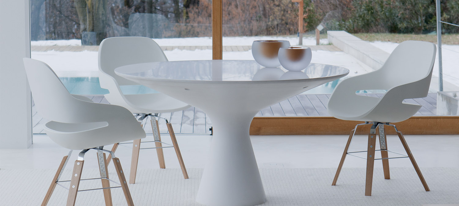 Le plateau et le piétement sont en Cristalplant, un matériau composite recyclable à 100%, hypoallergénique et agréable au toucher grâce à sa finition veloutée, semblable à la pierre naturelle. Elle est disponible avec un plateau en verre trempé, épaisseur 8 mm.