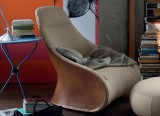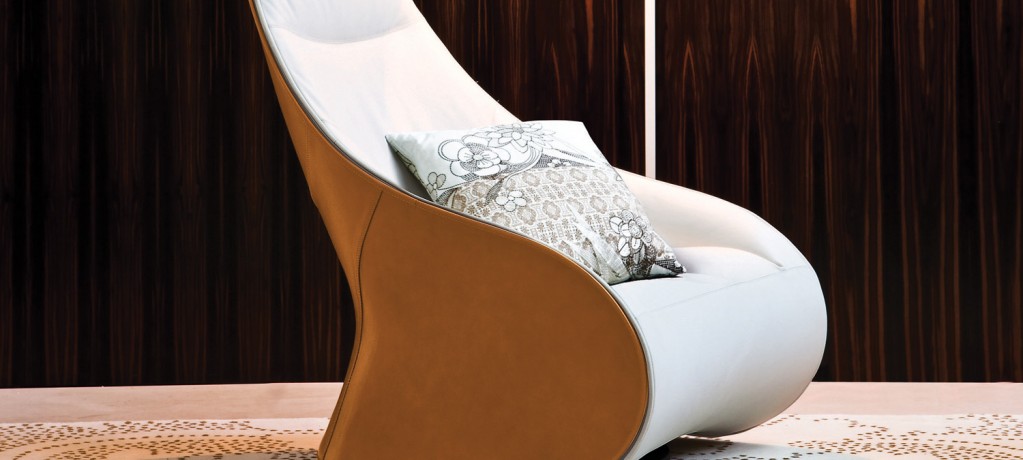 Fauteuil avec base pivotante ou fixe en acier. Coque extérieur en polyuréthane rigide, revêtue en cuir sellier 95 et une assise rembourrée en mousse Dacron Du Pont.