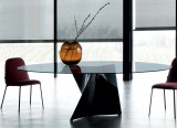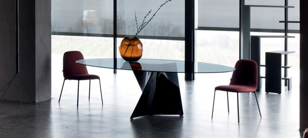 Table ronde ou ovale avec une base en cristalplant pigmenté dans la masse, couleur blanc mat ou laqué noir brillant. Plateau en verre trempé, épaisseur 8 mm, extra-clair acidifié blanc, transparent ou fumé gris ou bien en marbre blanc de Carrare.