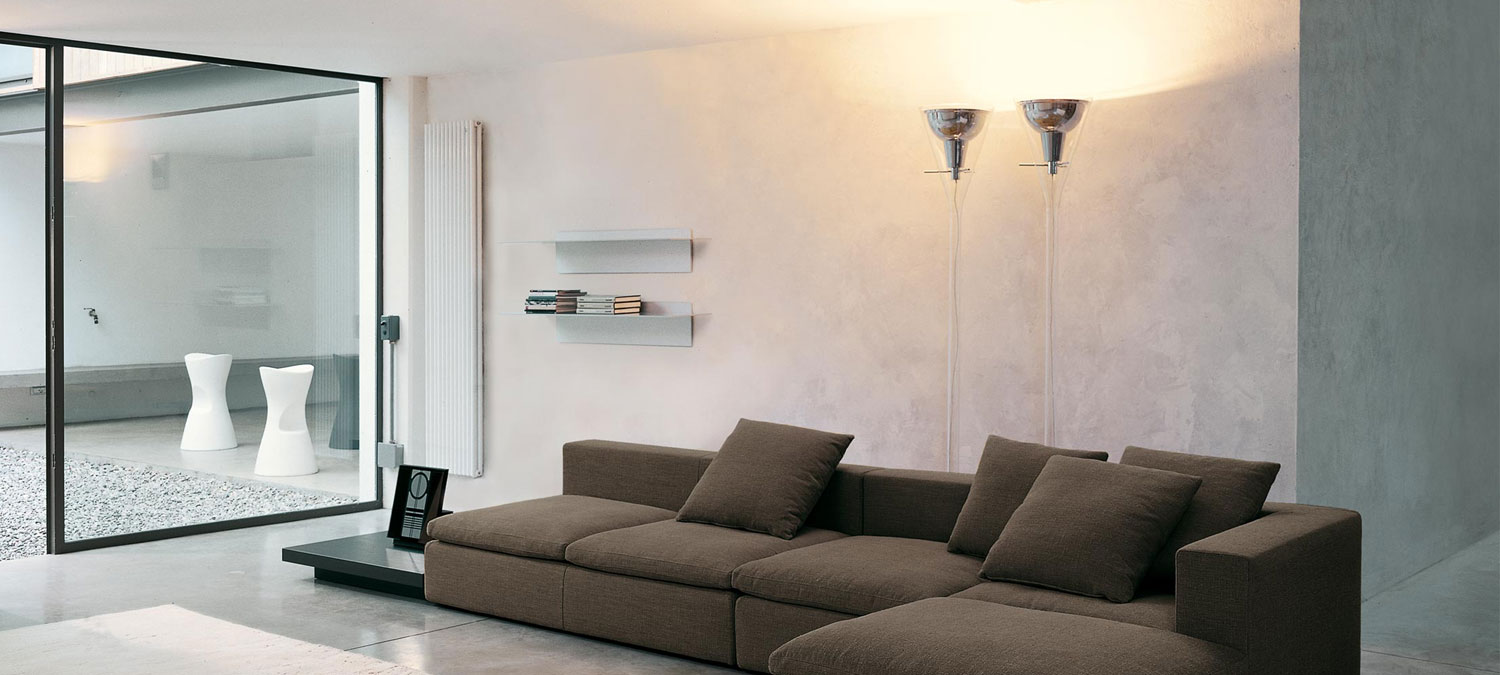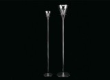 La famille de lampadaire Flûte et Magnum éditée par FontanaArte est composée d’un cône de verre qui contient le réflecteur en aluminium chromé, soutenu par trois fines tiges de métal.