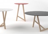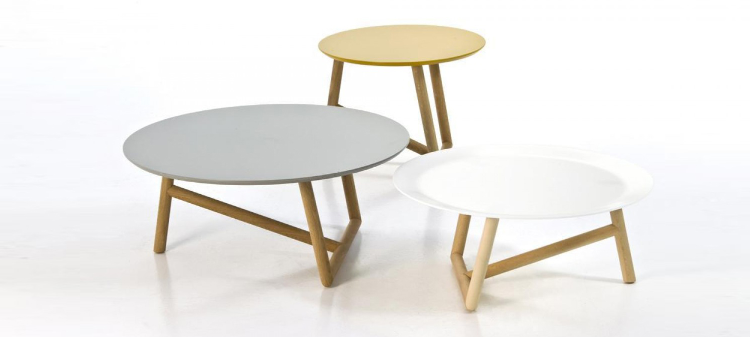 Cette table basse est composée d’un piétement en bois ciré et d’un plateau en composite de bois ou en corian®.
