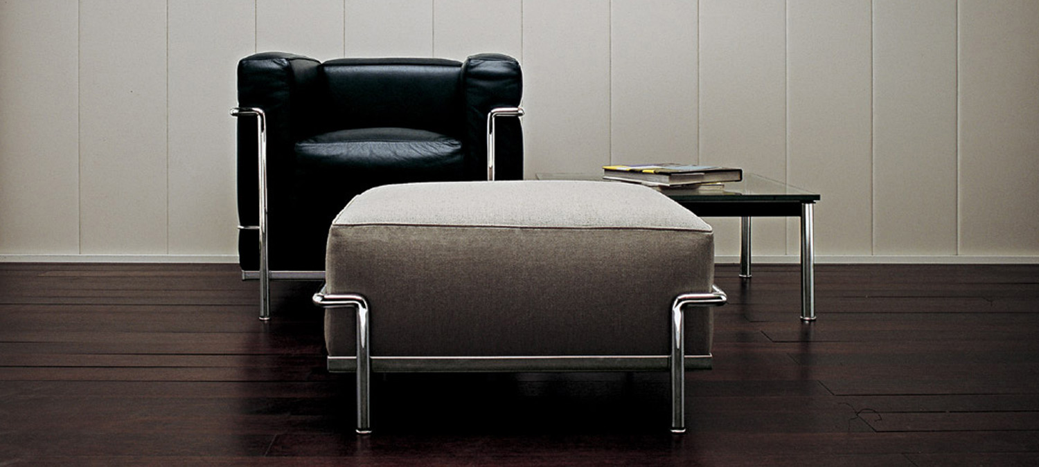 Salon d’Automne 1929. Fauteuil, canapés à deux ou bien trois places et pouf à structure en acier chromé brillant ou laqué. Coussins indépendants et revêtement cuir ou tissu.