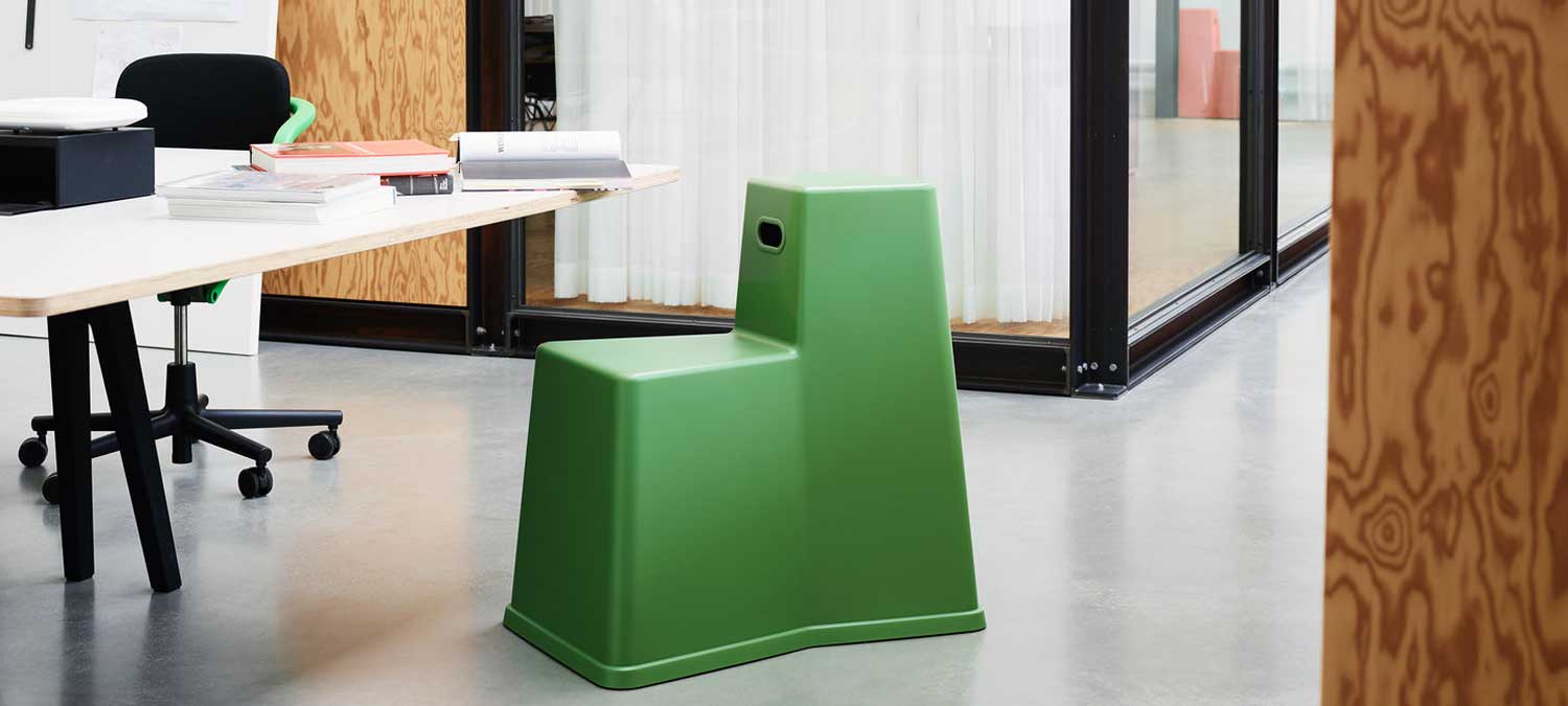 Avec ses plateformes, Stool-Tool, dessiné par Konstantin Grcic réunit différentes fonctions en un seul objet. Il offre différentes positions et orientations d’assise ; le dossier peut servir de petite surface de travail ou de rangement.