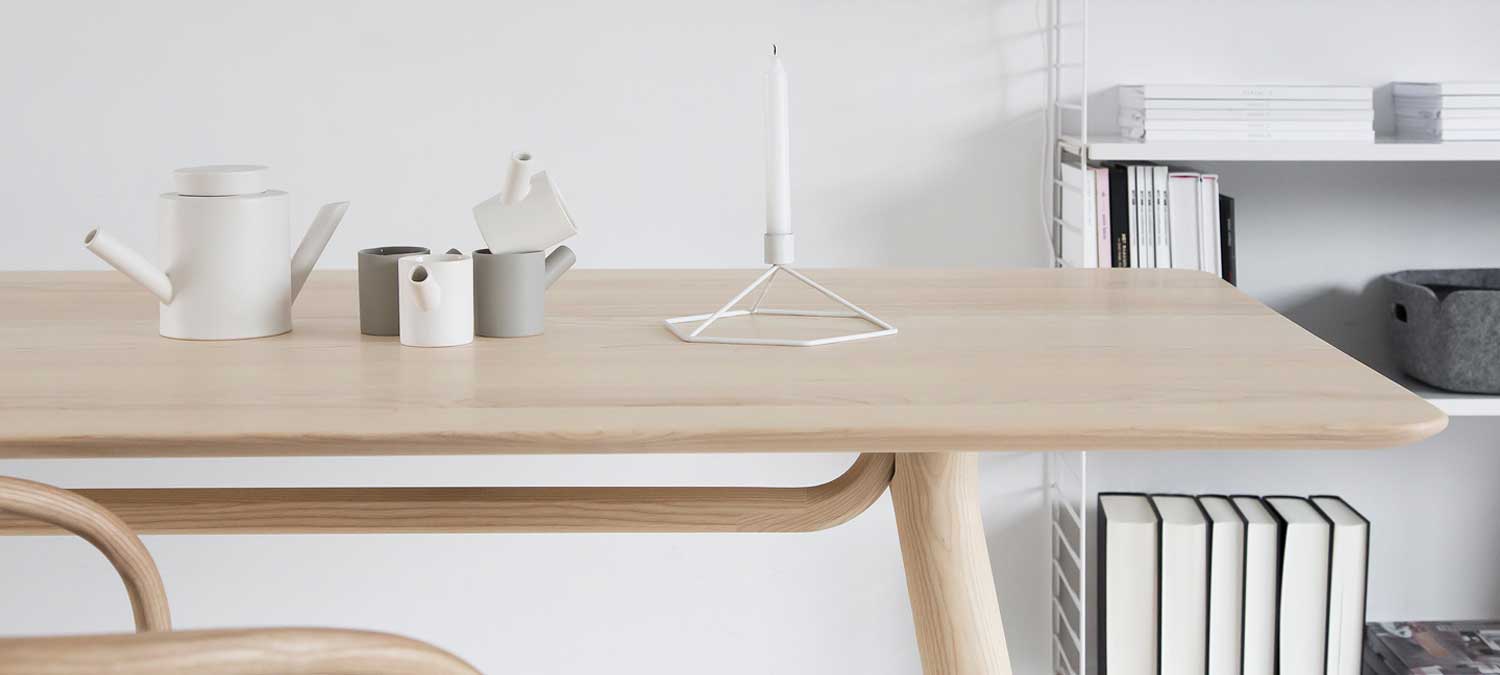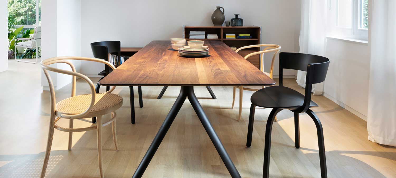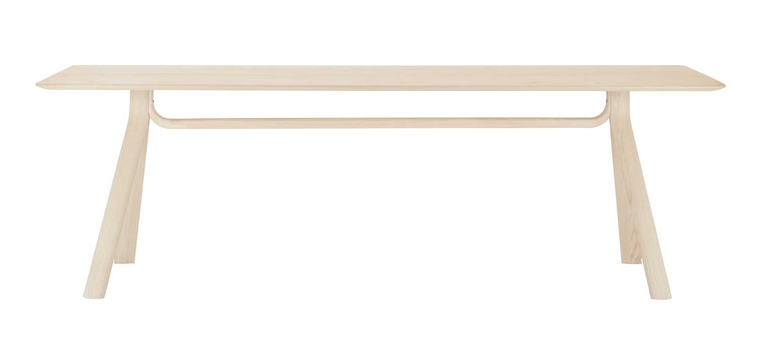 La table 1060 de Jorre van Ast, est une table en bois massif, qui allie lignes graphiques et finesse des détails. Le piétement en bois courbé soutient le plateau rectangulaire aux extrémités arrondies et aux chants biseautés.