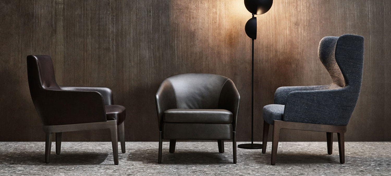 La collection de fauteuils et banquette Chelsea, dessinée par Rodolfo Dordoni, est pensée pour créer un espace convivial dans un grand salon et agencer un angle douillet réservé à la conversation et au repos. La structure en bois massif aux géométries essentielles s’équilibre avec la ligne fluide des dossiers.