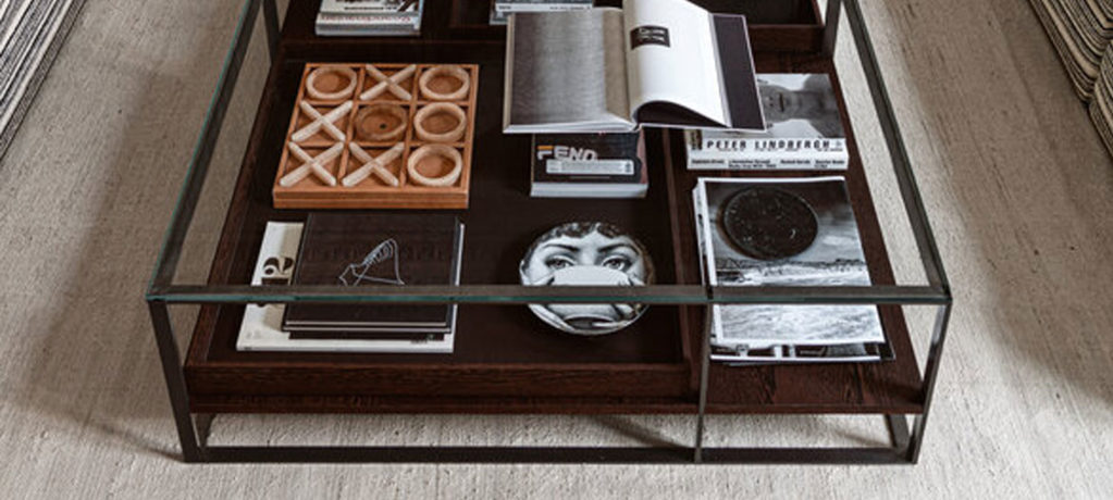 Conçues pour ranger et exposer des objets précieux avec une grande élégance, les tables basses Lithos associent un plateau en verre transparent à une structure en métal peint dans des teintes raffinées.